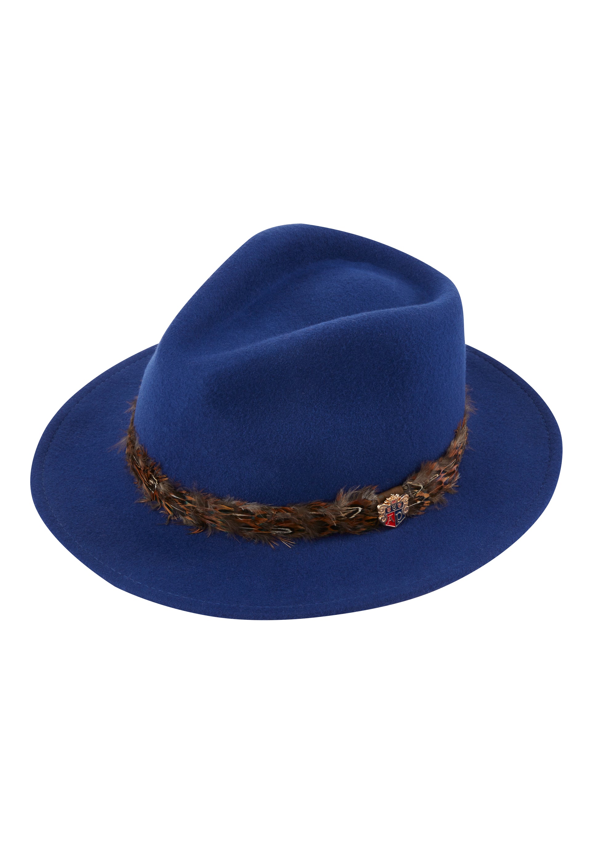 The Alan Paine 100% Wool Felt hat in this years most fashionable blue, comes with a pheasant feather wrap. This hat will go with any outfit, whether it is jeans and a gilet or complete with a full tweed ensemble.