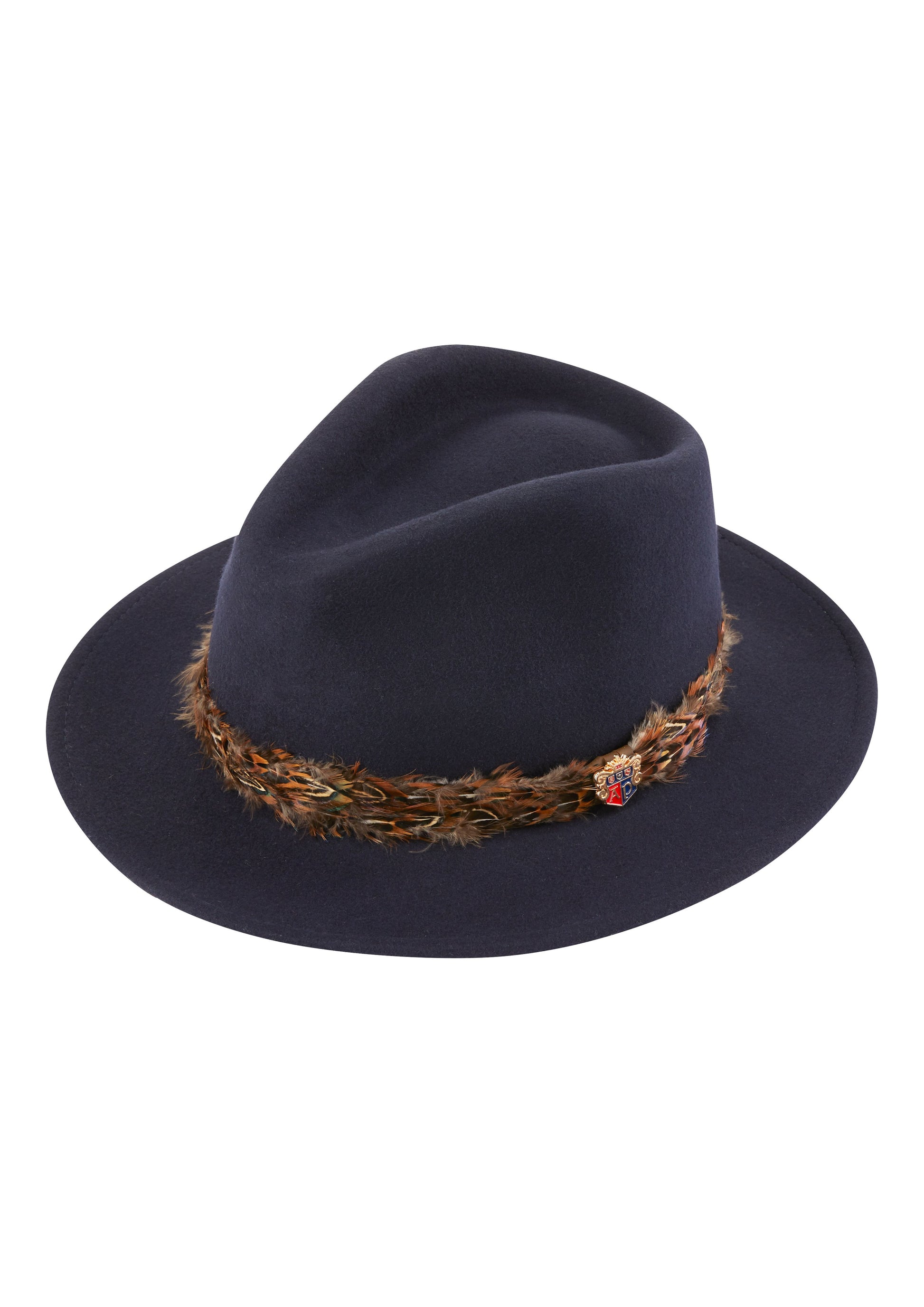 The Alan Paine 100% Wool Felt hat in Navy Blue, comes with a pheasant feather wrap. This hat will go with any outfit, whether it is jeans and a gilet or complete with a full tweed ensemble.
