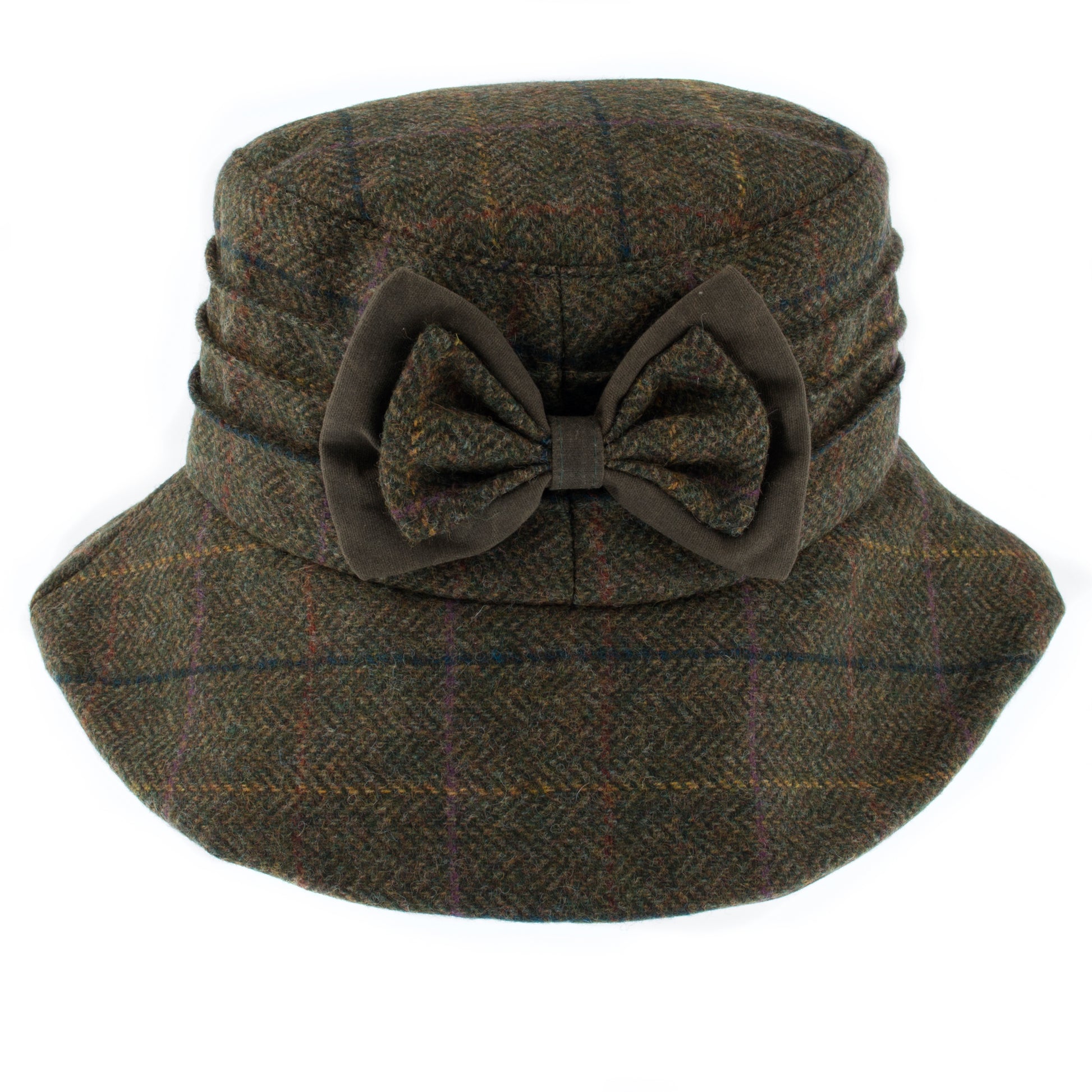 This Ladies Olive Check Tweed Bucket Hat made from the one of the finest wool makers in the UK Abraham Moon, A beautiful Bow detail is the perfect finishing touch, also with a wide brim and deep crown. Comes in one size at 57cm.