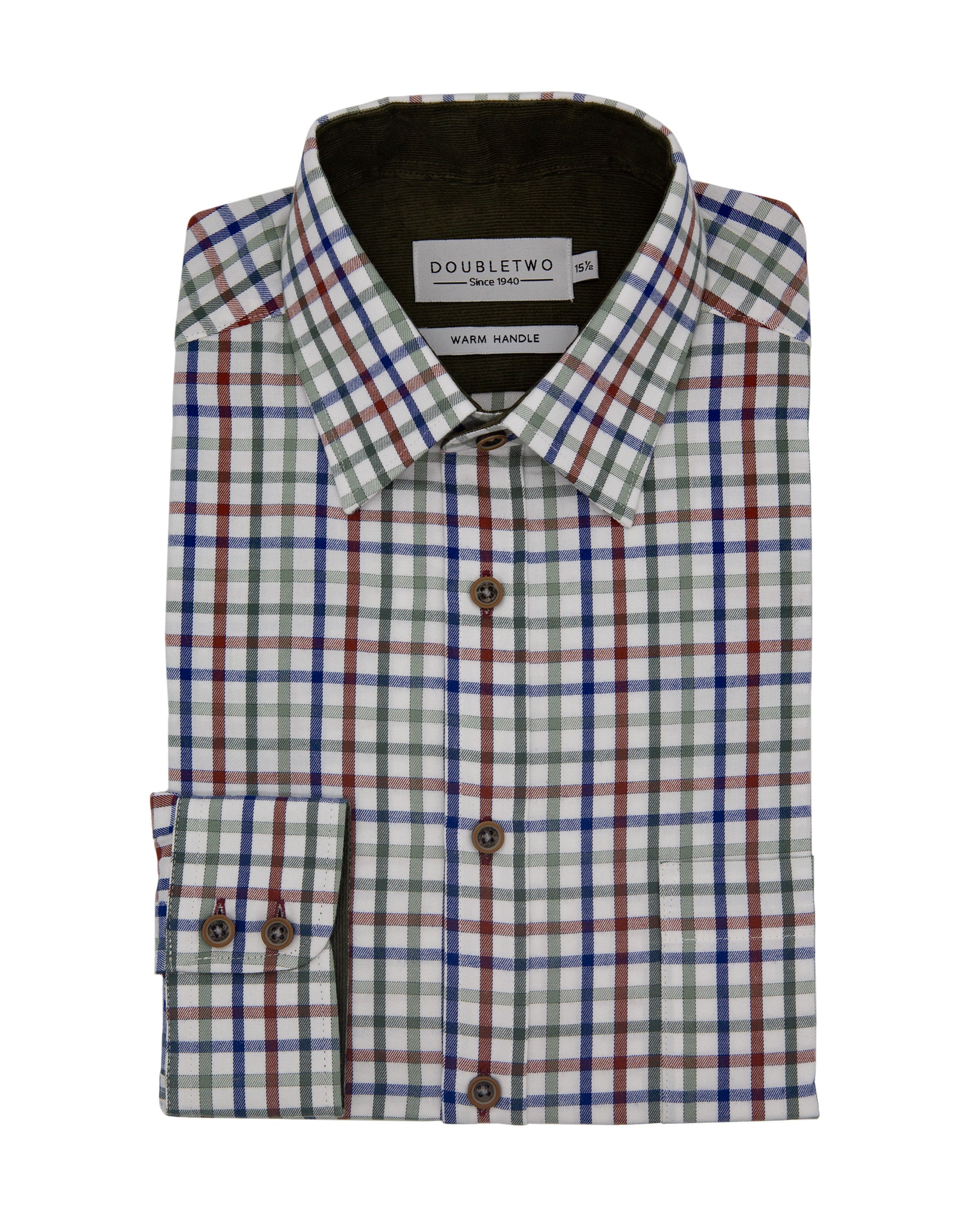This Fern Tattersall Check is woven from 100% peached cotton twill, this men's regular fit tattersall check shirt provides the complete Outdoor look. Tattersall check shirts are among the most popular in the UK, they include long sleeves, a breast pocket and twin pleats in the back for comfort. Striking Green Corduroy contrast on the inside of the collar and cuffs. Keeping you looking smart all day long, this expertly crafted shirt is available in regular sizes up to size 19".