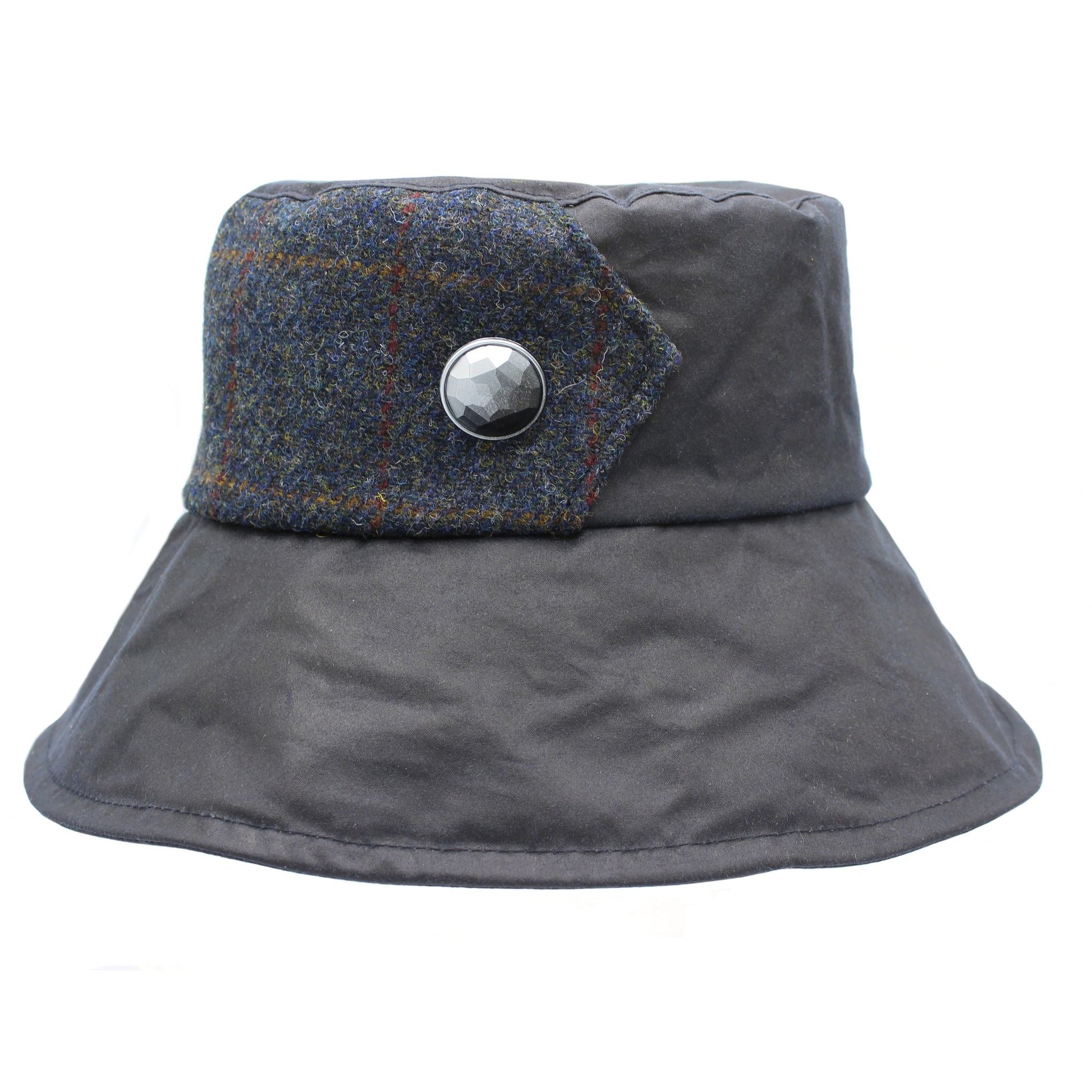 This Ladies Navy Wax Hat with a Blue Check Harris Tweed Detail has been made using the finest British Wax Cotton fabric, A beautiful Blue Check Harris Tweed fabric used on the top detail, also with a wide brim and deep crown.